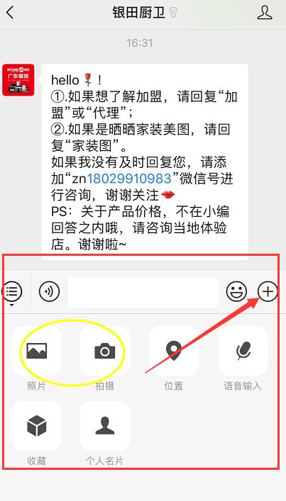 第二步:点击对话框,找到照片/拍摄键(如下图)