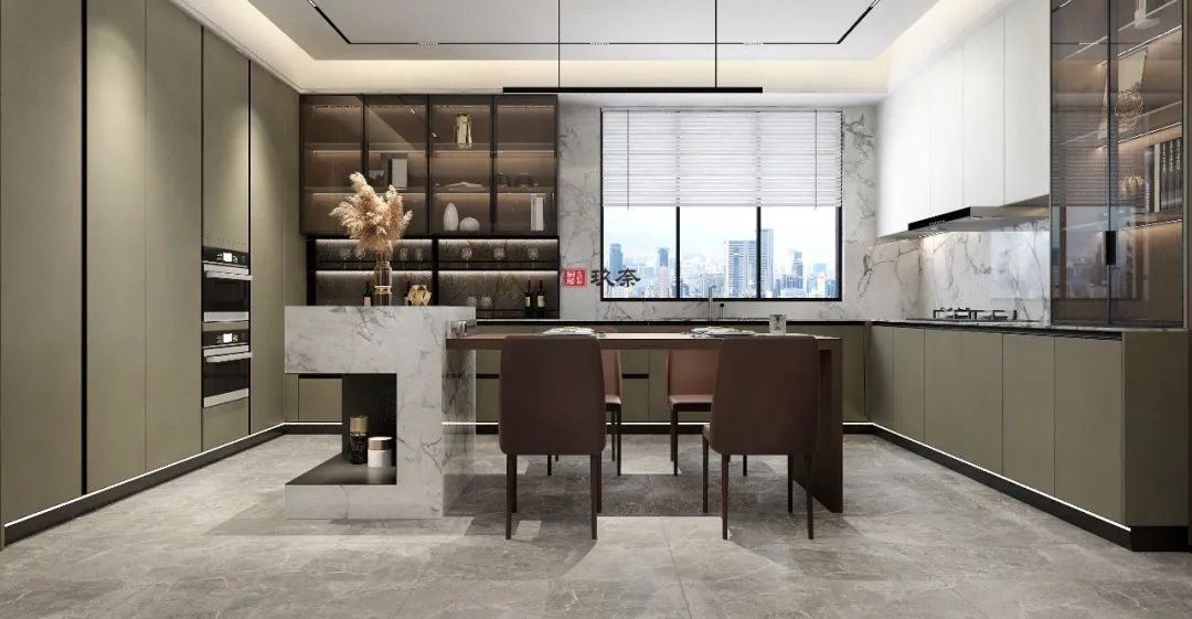 大户型的开放式厨房,一般会加入岛台设计,一方面当作另一个操作台使用,方便多人同时备菜;一方面也可以当作与餐桌之间的隔断。